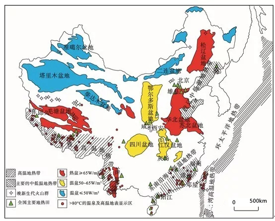 中國東部,高地溫梯度異常區(qū)多分布于松遼盆地、華北盆地及東南沿海地區(qū),地溫梯度多在4-5.°C/100m,最高可達(dá)7-8°C/ 100m,其分布多呈條帶狀,北東向延伸同地溫分布規(guī)律一致。
