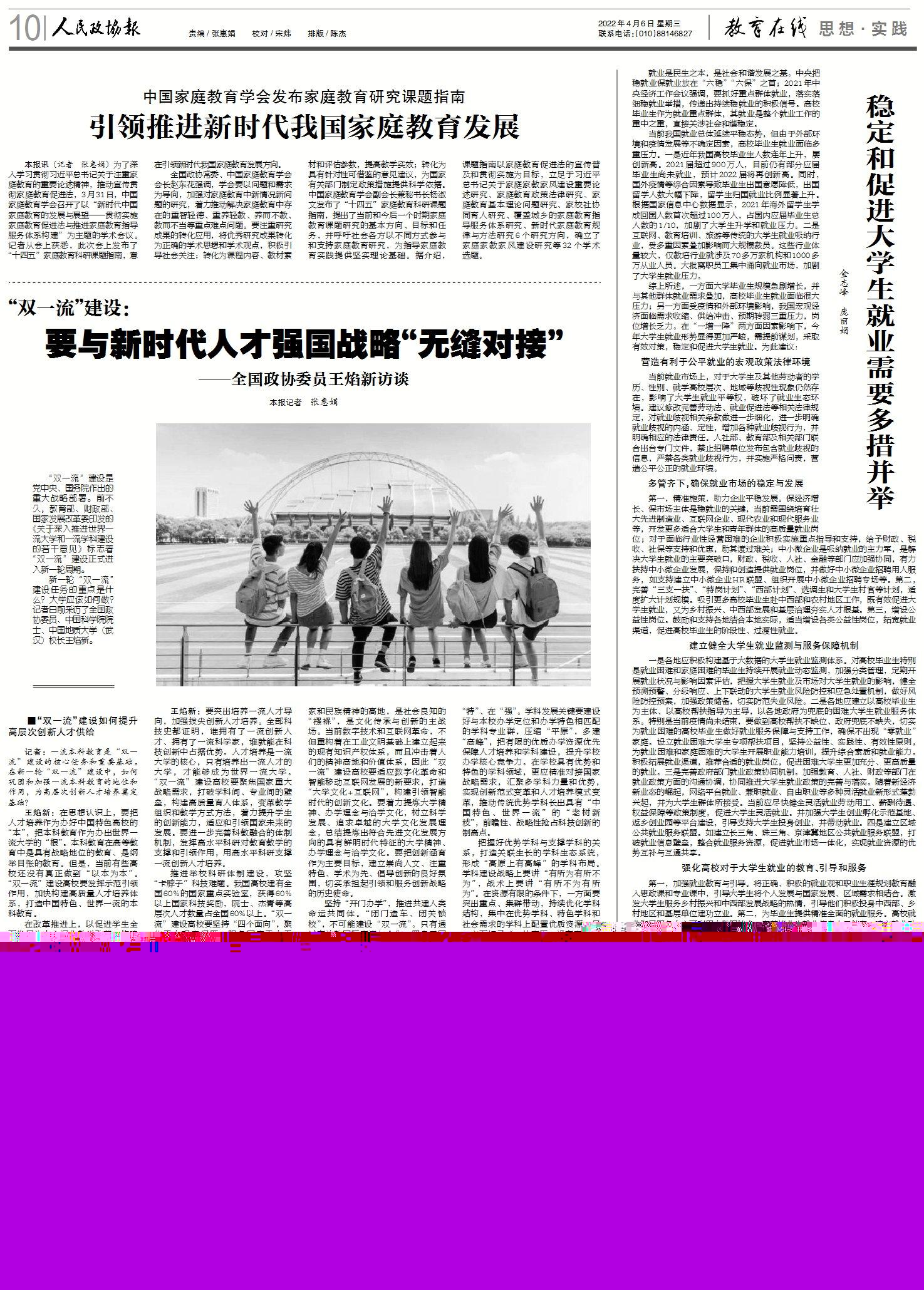 王焰新:要突出培養(yǎng)一流人才導向,加強拔尖創(chuàng)新人才培養(yǎng)。全部科技史都證明,誰擁有了一流創(chuàng)新人才、擁有了一流科學家,誰就能在科技創(chuàng)新中占據優(yōu)勢。人才培養(yǎng)是一流大學的核心,只有培養(yǎng)出一流人才的大學,才能夠成為世界一流大學。“雙一流”建設高校要聚焦國家重大戰(zhàn)略需求,打破學科間、專業(yè)間的壁壘,構建高質量育人體系,變革教學組織和教學方式方法,著力提升學生的創(chuàng)新能力,適應和引領國家未來的發(fā)展。要進一步完善科教融合的體制機制,發(fā)揮高水平科研對教育教學的支撐和引領作用,用高水平科研支撐一流創(chuàng)新人才培養(yǎng)。