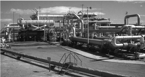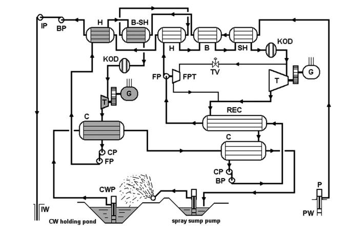 起初的電站使用的就是普通的雙循環(huán)地?zé)岚l(fā)電流程的機(jī)組。在優(yōu)化了1979年開(kāi)始使用的發(fā)電機(jī)組以后,修整后的地?zé)犭娬臼且粋€(gè)完全不同的發(fā)電機(jī)組。以前的主渦輪機(jī)、真回流熱電轉(zhuǎn)換器、和交互蘭金循環(huán)都被還掉了。取而代之的是,一個(gè)簡(jiǎn)單的,非提取異丁烷渦輪,和九個(gè)更大的鹵水熱電交換機(jī)。在熱電交換機(jī)的管道所在的一邊是鹵水,在殼側(cè)是碳水化合物。驅(qū)動(dòng)沸騰給水渦輪的異丁烷來(lái)自于一個(gè)單獨(dú)的過(guò)熱器的側(cè)流。發(fā)電系統(tǒng)上安裝了一個(gè)降壓閥,來(lái)降低異丁烷的壓力以適應(yīng)BFPT的注入壓力。換熱器沒(méi)有更換,但是現(xiàn)在只是作為一個(gè)異丁烷循環(huán)的預(yù)熱器。丙烷循環(huán)現(xiàn)在也已經(jīng)獨(dú)立于異丁烷循環(huán)。