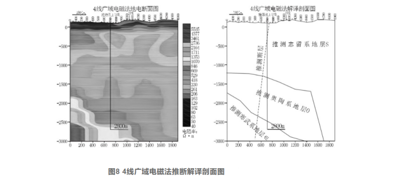(3)各地層厚度及電阻率特征,志留系(S)地層電阻基本小于500Ω·m,厚度900-1800m;奧陶系O地層電阻率400~900Ω·m,厚度大于300 m,向南西側厚度急劇增大;寒武系∈地層電阻率基本大于900Ω·m,根據斷裂構造發育、裂隙發育等因素影響呈現不同電阻率,厚度未揭穿。